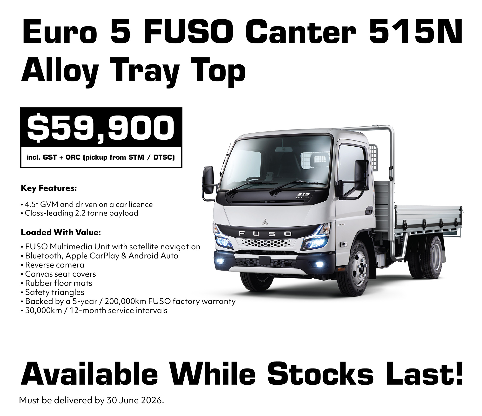 The Euro 5 FUSO Canter 515N Alloy Tray Top is available now from $59,900 incl. GST + ORC (pickup from STM / DTSC).